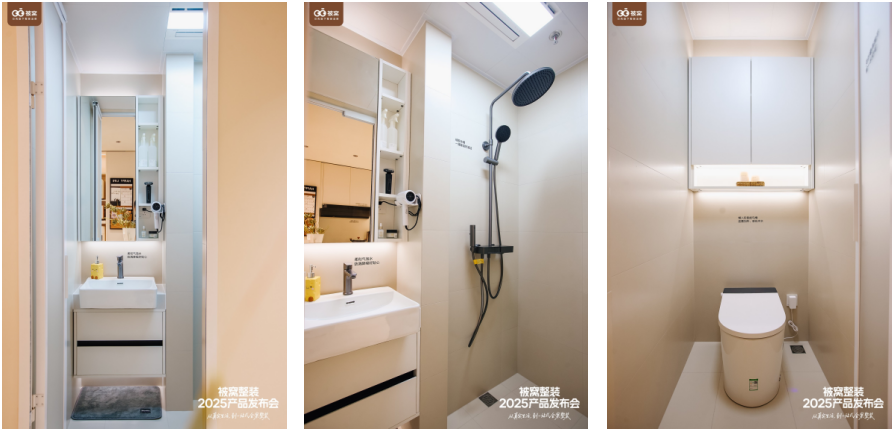 将马桶区与洗漱、淋浴区分离,避免空间冲突,实现多人共用。采用推拉折叠门,极限提升空间利用率,不挡马桶,不占过道空间,且无地轨方便打扫。选用置物花洒、平角龙头等高品质洁具,强调耐用性和易清洁,即使在极小空间内也做到功能够用、尺度适宜。